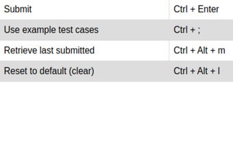 Ngoài phím tắt gửi code, tiện ích còn cung cấp các phím tắt tiện lợi khác. Bạn có thể chạy code của mình với các bộ test ví dụ bằng cách nhấn Ctrl + ', gửi code của bạn bằng Ctrl + Enter và lấy lại code đã gửi cuối cùng của bạn bằng cách nhấn Ctrl + Alt + m hai lần. Nếu bạn muốn đặt lại code của mình về trạng thái mặc định, bạn có thể làm điều đó dễ dàng bằng cách nhấn Ctrl + Alt + l.